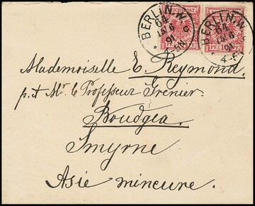 10 Pfg. per zwei auf Couvert von Berlin W64 1891 nach Smyrne/Türkei, ferner eine Germaniakarte nach Smyrne, sowie vier Ganzsachenkarten 10 Pfg. Krone-Adler je nach Beirut/Syrien