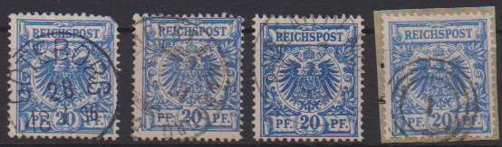 20 Pfg., vier Werte je mit (Schiffspost-) Fremdentwertungen: dänischer NS "1", K1 von Göteborg ("eckrund"), "Hammerfest-Hamburg" und K1 "Bureau de Mer"
