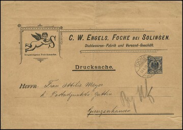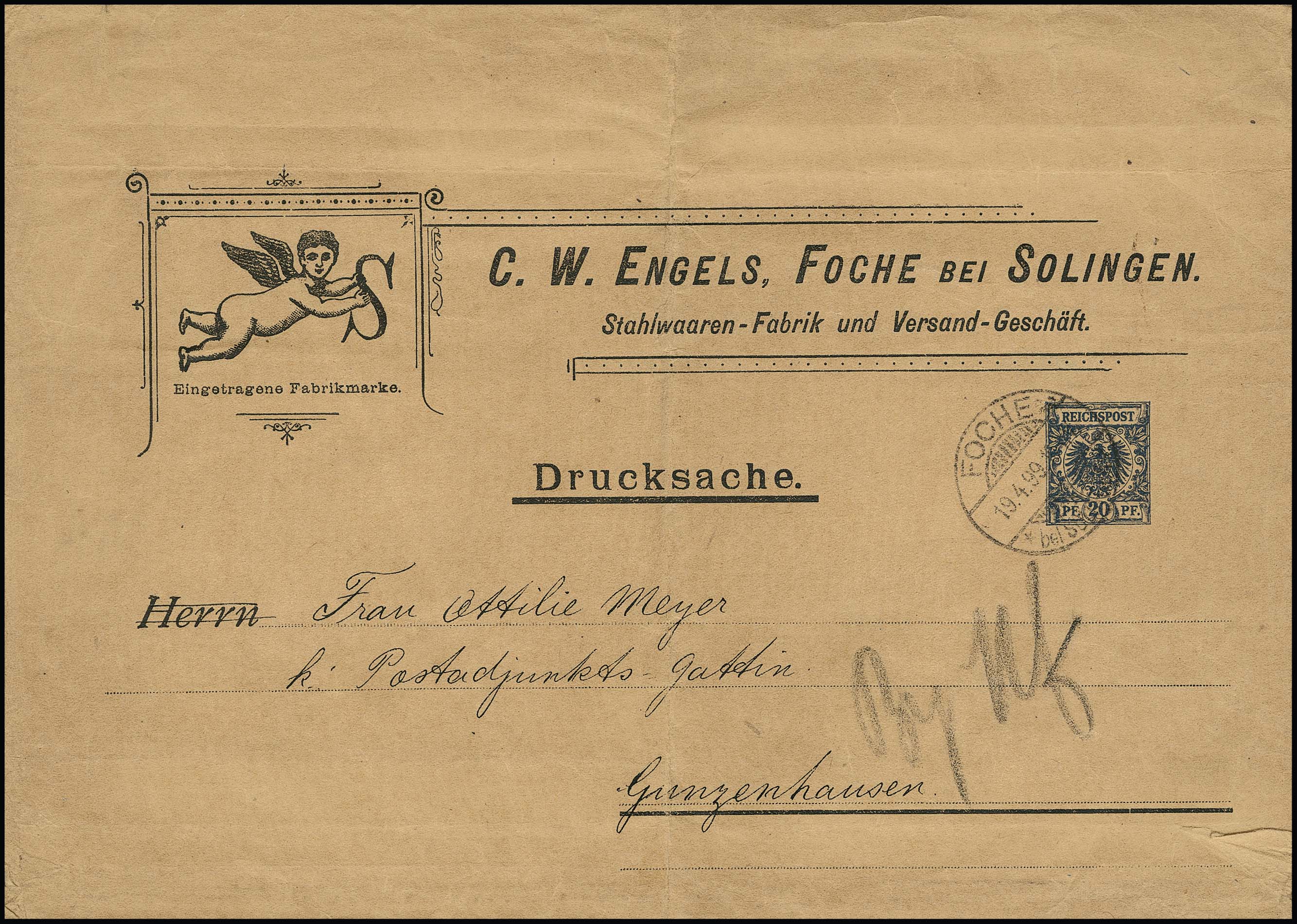 Privat-Ganzsachen-Streifband der Fa. Engels aus Foche bei Solingen, 20 Pfg. blau als Drucksache der 4. Gewichtsstufe (!), übliche Gebrauchserhaltung wie Falten etc.