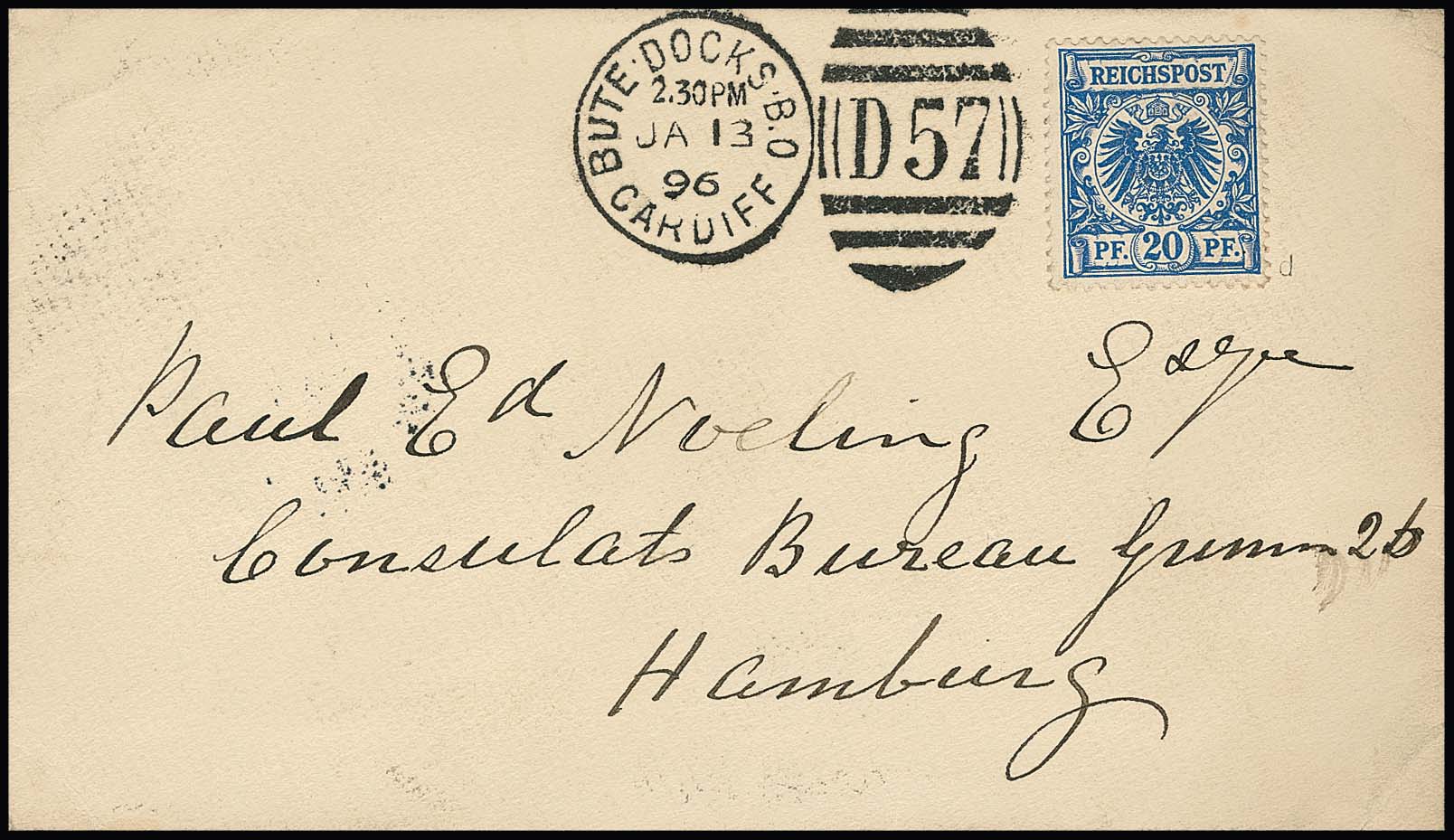 20 Pfg. einzeln auf Couvert in seltener Fremdverwendung in England aus Cardiff Bute Docks (Duplexstempel "D57" nebengesetzt), ohne Nachtaxe 1896 nach Hamburg, ungewöhnlich!