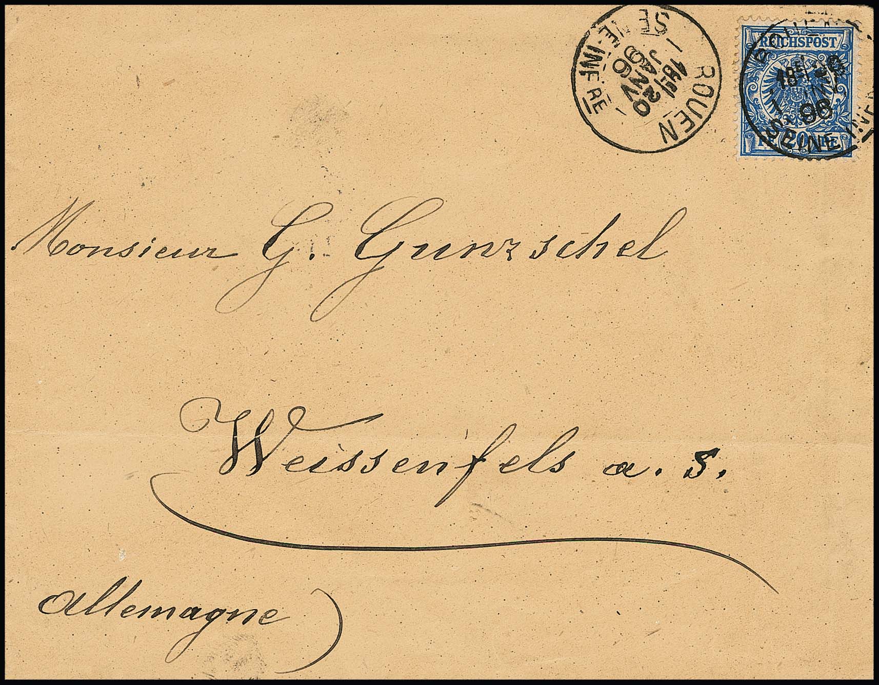 20 Pfg. einzeln auf zwei Briefen (einmal kl. Papierfehler), unbeanstandet in Frankreich verwandt mit französ. K2 "Marseille Bourse" 1890 bzw. "Rouen" 1896, je ohne Nachtaxe nach Deutschland