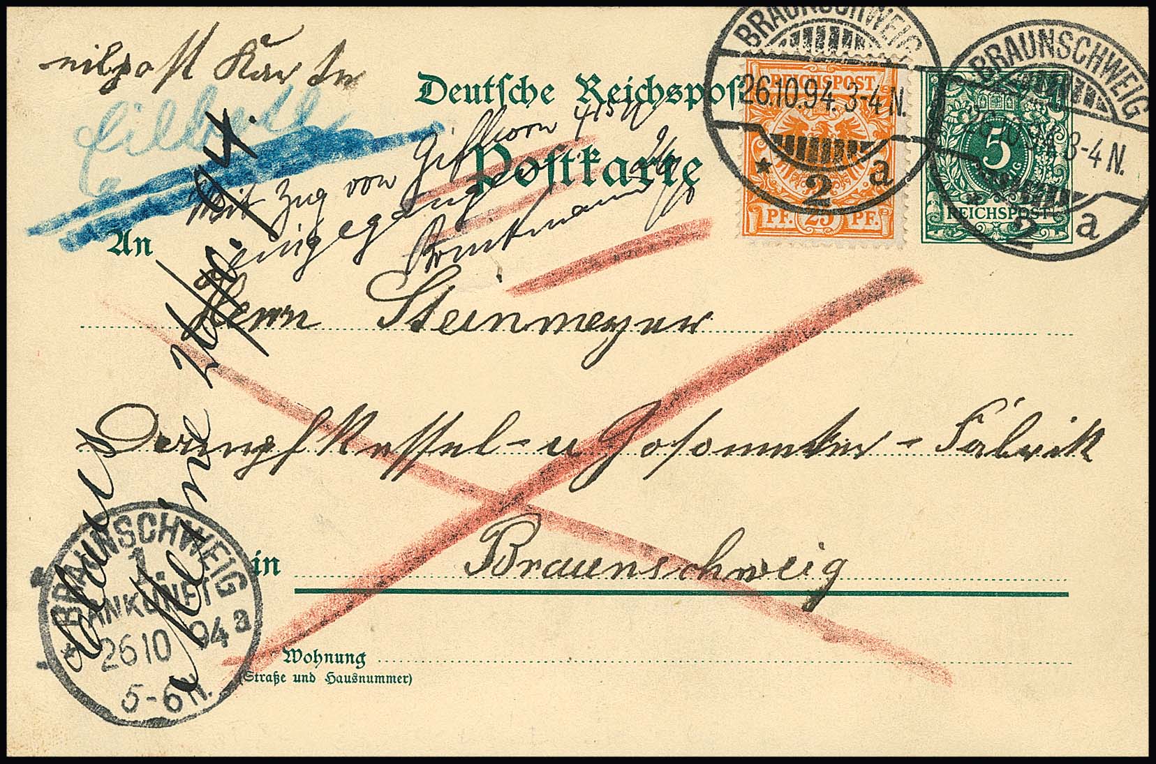 25 Pfg. auf 5 Pfg.-Postkarte, als augenscheinliche Orts-Expreßkarte aus Braunschweig 1894, die Eilbestellung innerorts war jedoch erst ab 1.4.1900 erlaubt, hier dennoch befördert, da lt. hs. Vermerk "Mit dem Zug von Gifhorn 4.15 Uhr eingegangen" und erst in Braunschweig entwertet