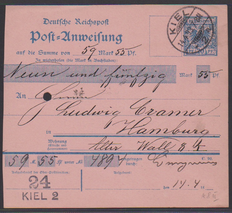 Postanweisungs-Ganzsache 20 Pfg. gebraucht von Kiel 1893