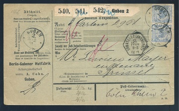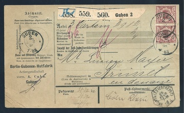 50 Pfg. braunrot, zwei Paare, nebst Paar 20 Pfg., auf Auslands-Paketkarte (Formular typische Gebrauchsspuren) von Guben 1891 nach Belgien