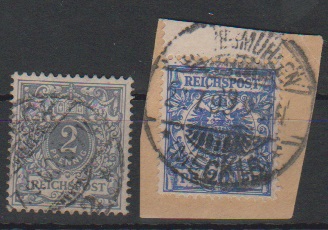 20 Pfg. preußischblau auf Briefstück, sowie 2 Pfg. mit Plattenfehler "REIGHS" lose gest., sign. Zenker bzw. Jäschke. Mi. 330,-