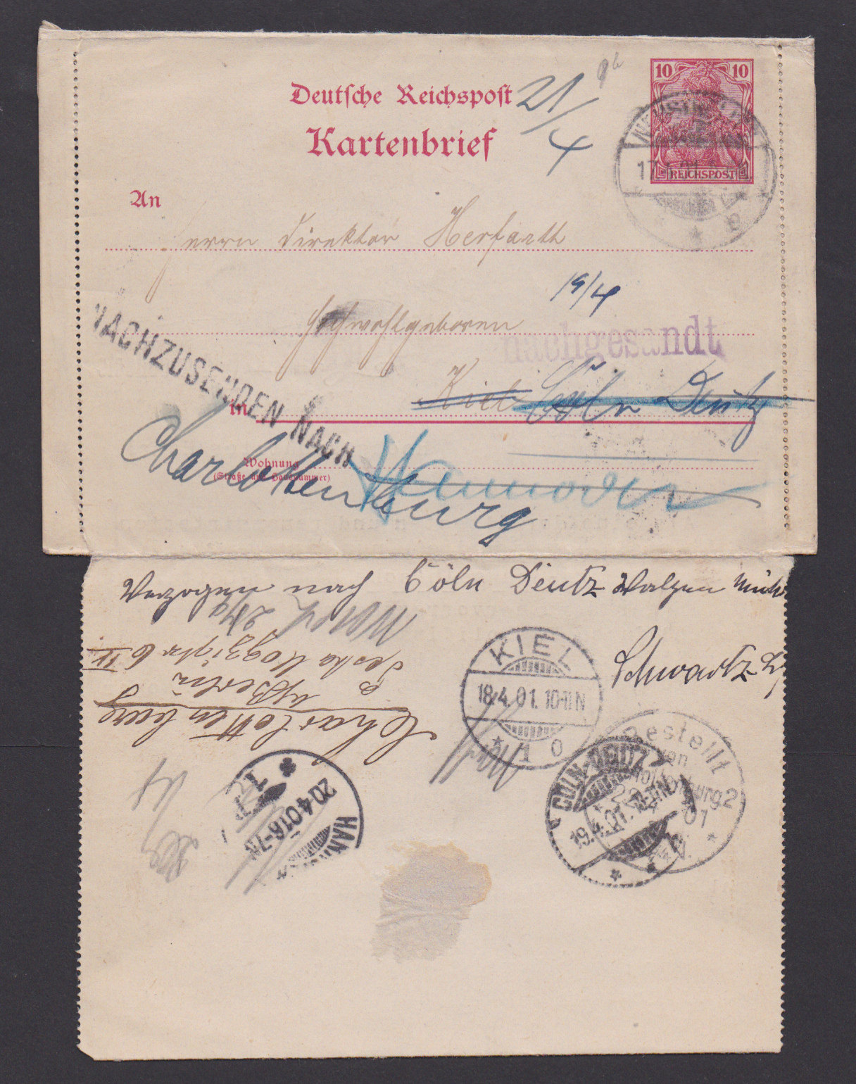 Kartenbrief-Ganzsache 10 Pfg. 1901 als Retourbrief, innen seltener privater Postkarten-ähnlicher Zudruck "Gruss aus Neustrelitz, Glückscollecte D. Lenin"