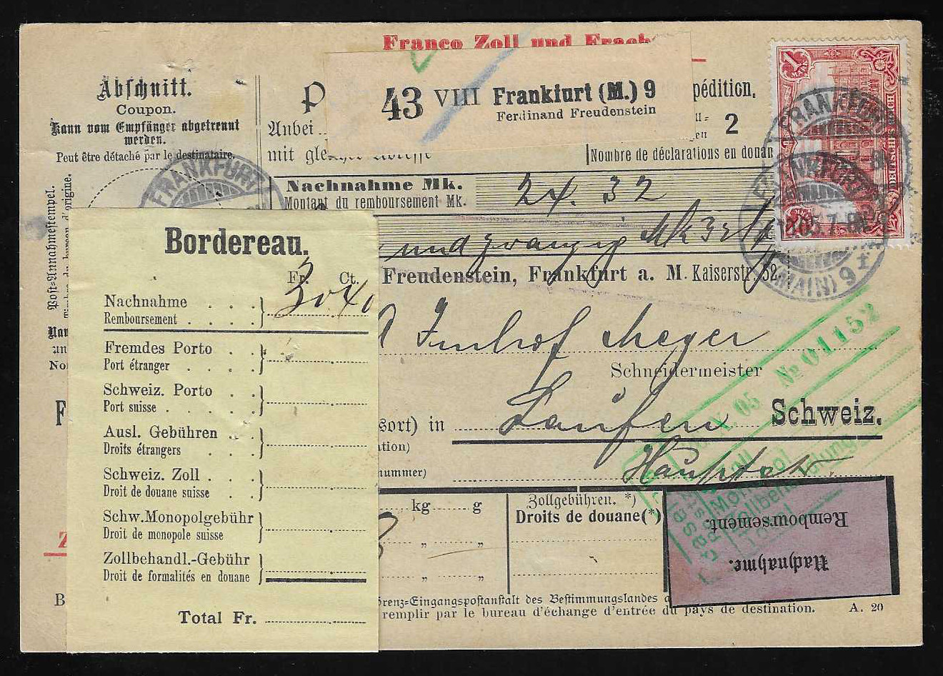 1 Mk. karminrot einzeln auf Auslands-Paketkarte von Frankfurt 1905 in die Schweiz, sign. Jäschke-L. Mi. 160,-