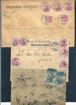 5 Pfg. Kriegsdruck per 40 vs./rs. als seltene hohe MeF auf Brief aus Schönkirchen 1922, gebrauchsbedingte Erhaltung, dazu Wertbrief mit fünfmal 10 Pfg. 1906, sowie Mehrfach-Frankatur 10 Pfg. (Nr. 86I) per acht, ungewöhnliche MeF!