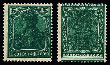 5 Pfg. Kriegsdruck, beide Doppeldrucke tadellos ungebraucht, einmal normal, einmal der zweite Druck kopfstehend (Attest Jäschke-L.), Mi. 850,-