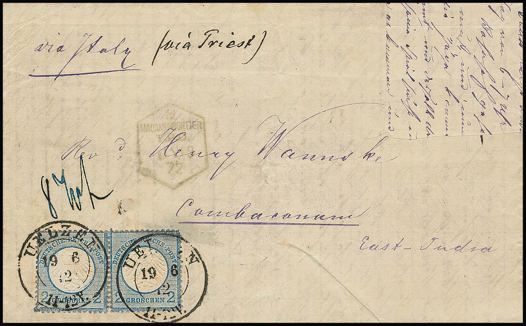 2 Gr. blau im Paar auf Faltbrief von Uelzen 1872 via Triest nach Ost-Indien. Trotz Fehlern (u.a. rechts oben eine Marke ausgeschnitten) ein seltener Brief