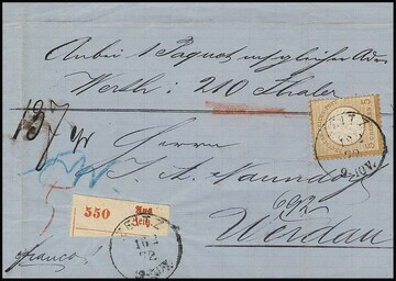 1 Gr. rosa per drei auf Expreß-Faltbrief, mit rotem K1 "Bremen F.N.2" als Markenentwertung, nach Hamburg. Die fehlenden 1/2 Gr. bar bezahlt, rechte Marke "eckrund" und Brief etwas knittrig, jedoch in vorliegender Form mit der irregulären roten Franko-Stempel-Entwertung von größter Seltenheit, Atteste Brugger, Hennies, Rummel, Foto siehe Katalog-Rückseite