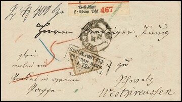 5 Gr. ockerbraun in Mischfrankatur mit 1 Gr. karmin, Kabinettstücke rs. auf Paketbegleitbrief mit K2 "Berlin P.E. No. 1", sign. Krug