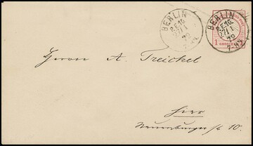Ganzsache 1 Gr. rosa als Berliner Ortscouvert gelaufen mit K1 "Berlin P.E. 10" vom 27.1.1872, mit prominentem Empfänger Treichel