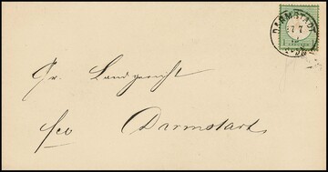 1 Kr. grün, kl. Schild (min. Tönung), auf sauberem Ortsbrief, sowie 1 Kr., gr. Schild, auf Ortskarte, je Einzelfrankaturen aus Darmstadt, Mi. 370,-