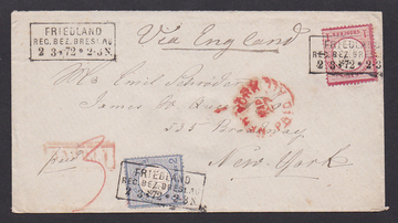 1 Gr. rosa per drei von versch. Auflagen (einmal rauhe Zähnung) auf Reco-Doppelbrief mit K2 "Pollitz" 1872, ferner im Paar auf Kabinettbrief mit K1 "Magdeburg", sowie 1 und 2 Gr. auf Überseebrief von Friedland nach New York