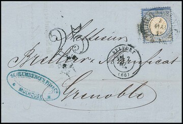 2 Gr. blau, Prachtstück mit HE von Mühlhausen in Doppelfrankatur mit Taxstempel "25" und K2 "Belfort" auf Brief nach Grenoble