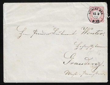 Ganzsache 1 Gr. rosa, kleines Schild, überdurchschnittlich gut erhaltene großformatige Ganzsache mit K1 "Reinerz Bad", Mi. 350,-