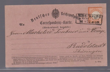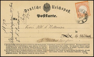 1/2 Gr. orange, kl. Schild, zweimal auf rosa Correspondenz-Doppelkarte, Frageteil aus Hirschberg/Schlesien (Ra3) gelaufen, Antwortteil mit ungestempelter Marke, die auch ohne Gummi selten ist!