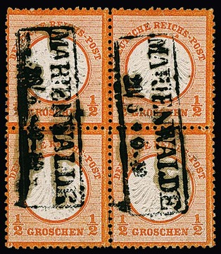 1/2 Gr. orange, seltener Viererblock mit Ra2 "Marienwalde". Die rechte obere Marke (Einriß) mit Plattenfehler "Farbpunkt unter H von REICHS" (Feld 67), die Marke daneben jedoch ohne den Plattenfehler von Feld 66. Mi. 1100,- + PF