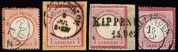 1/2 Gr. orange (K1 "Baden"), sowie 1 Gr. rosa, mit L2 "Kippenheim" (R!), K2 "Villingen" (Plattenfehler XXIIIa) und K1 "Gengenbach", vier Werte in etwas untersch. Erhaltung je währungsfremdverwendet im Kreuzergebiet mit nachverw. Baden-Stempeln. Drei Befunde Krug/Brugger