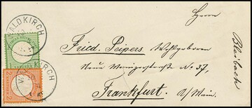 2 Kr. orange, rauh gezähnt, und 1 Kr. grün, Prachtstücke auf Damencouvert (kl. Riß) von Waldkirch (K1) 1874 nach Frankfurt