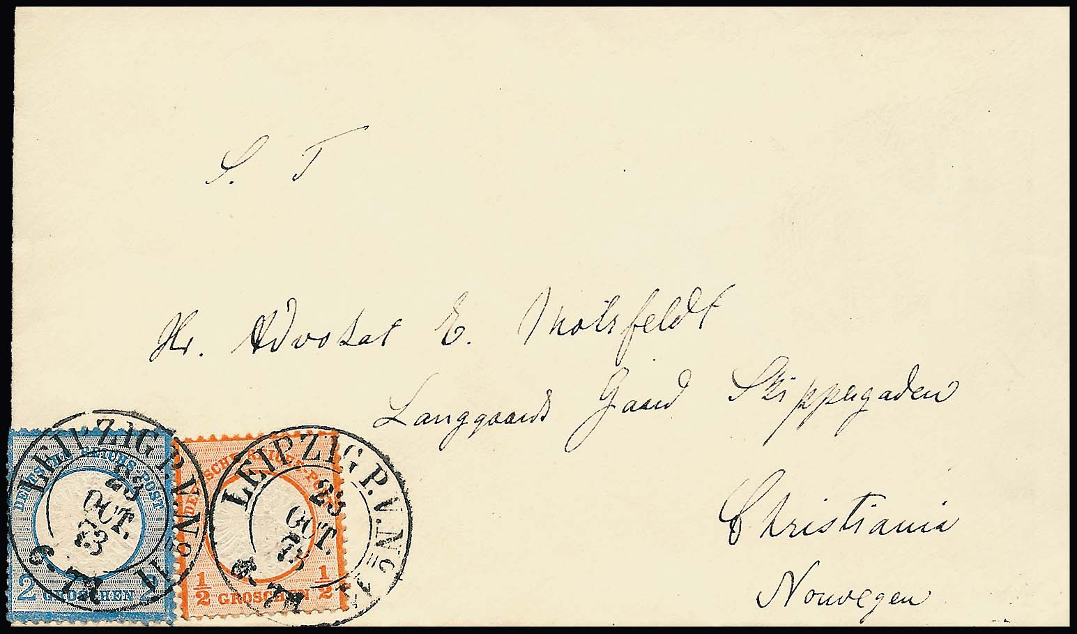 1/2 Gr. orange (kleine Marke L15) und links etwas um den Rand geklebte 2 Gr. blau auf Prachtcouvert (rs. fehlt ein kleines Klappenteil) von Leipzig 1873 nach Christiania/Norwegen