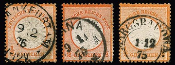 1/2 Gr. orange, drei Werte (ein Fehlzahn bei einem Wert, sowie einmal Eckbugspur) je mit sehr späten Verwendungen, 9.11.75, 1.12.75 und 9.12.75 (Frankfurt, ehem. Kreuzergebiet), zwei Fotoexp. Sommer bzw. Krug