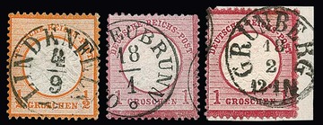 1/2 Gr. orange und 1 Gr. rosa (etwas hell) je mit klaren Stempeln vom Währungsersttag der Pfennigzeit, 1.1.75, K1 "Charlottenbrunn" bzw. K2 "Goerbersdorf"
