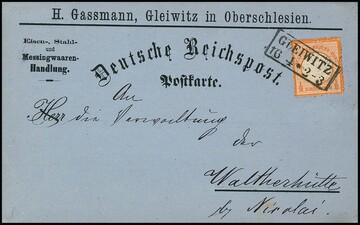 1/2 Gr. orange je einzeln auf zwei Privatpostkarten ohne Reichsadler-Zudruck, von Kabel (Ra2) nach Fickenhütten (!), sowie aus Gleiwitz (Marke Plattenfehler XII, ein kurzer Zahn, Fotoexp. Krug)