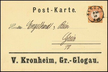 1/2 Gr. orange, je perfekte Exemplare einzeln auf zwei hübschen Privat-Postkarten mit gleichem Vordruck und aus gleicher Korrespondenz aus Glogau nach Greiz, Vordruck schwarz und violett