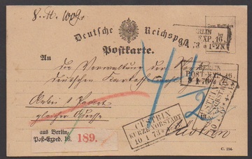 1873, Ra3 "Berlin Post-Exp. 16" auf unfrankierter Postkarte, mit Bartaxe "4 1/2" (Gr.) als Paketbegleitung nach Cüstrin