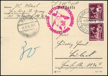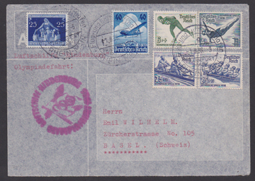 Olympiafahrt 1936, Brief mit u.a. Olympia-Marken, Auflieferung Flughafen Rhein-Main, Frankfurt, in die Schweiz, Sieger 110,-