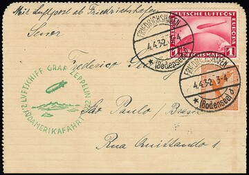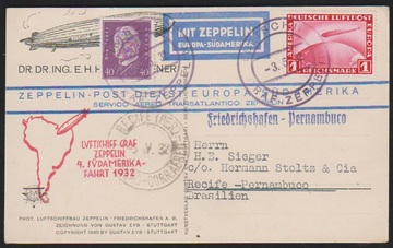 4. SAF 1932, Bordpostkarte der Hinfahrt mit u.a. 1 RM Zeppelin