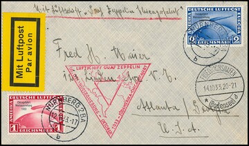 Chicagofahrt 1933, Brief ab Nürnberg mit 1 und 2 RM Chicagofahrt, Auflieferung Friedrichshafen bis Atlanta/USA, Mi. 800,- + Sieger