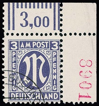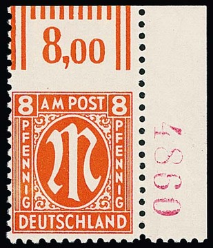 8 Pfg., ungebrauchte rechte obere Bogenecke mit sowohl vierstelliger Bogenzähl-Nr. als auch oben ungezähnt, seltene Variante!