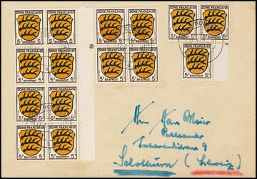 5 Pfg. per 15 in Einheiten, sowie 15 Pfg. im Fünferstreifen, je als gute hohe MeF auf zwei Auslandsbriefen in die Schweiz
