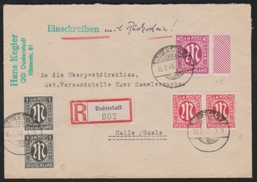 1 u. 15 Pfg. je im Paar, nebst Randstück 40 Pfg., auf R-Brief gg. Rsch. ab Duderstadt, dabei eine 15 Pfg. mit interessanter, herstellungsbedingter Quetschfalte