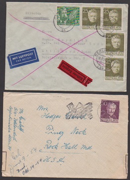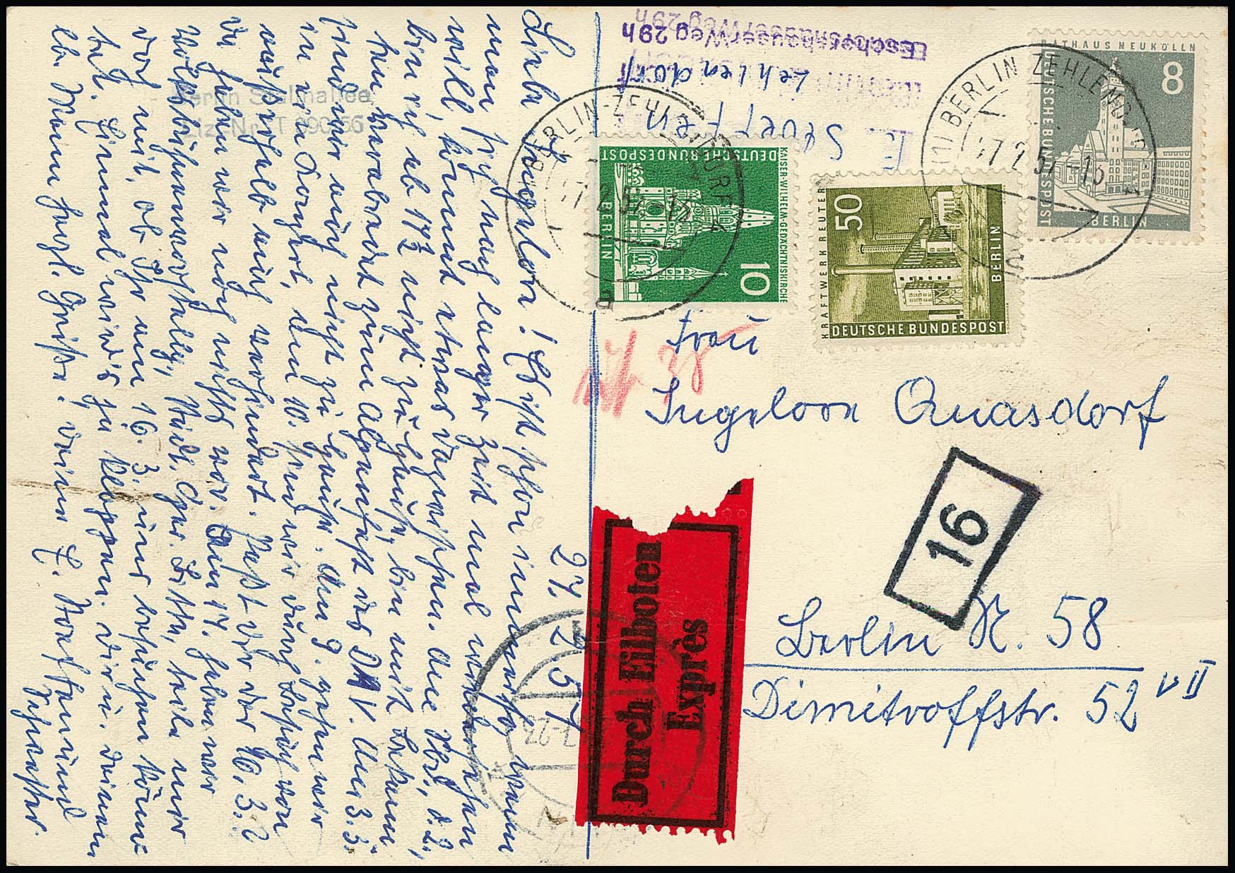 Zwei seltene Expreßkarten ab Berlin: 5 und siebenmal 10 Pfg. Stadtbilder auf Lupo-Expreß-Karte von "Berlin SW11" nach München, sowie 8, 10 u. 50 Pfg. auf seltener Orts-Expreßkarte ab Zehlendorf 1957