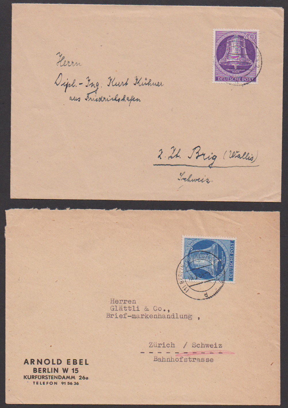 30 Pfg. Glocke Mitte als portoger. Einzelfrankatur auf Brief von Berlin in die Schweiz, ferner zwei versch. EF 40 Pfg., auf Auslandsbrief, sowie Lupo-Übersee-Drucksache (ab Altötting)