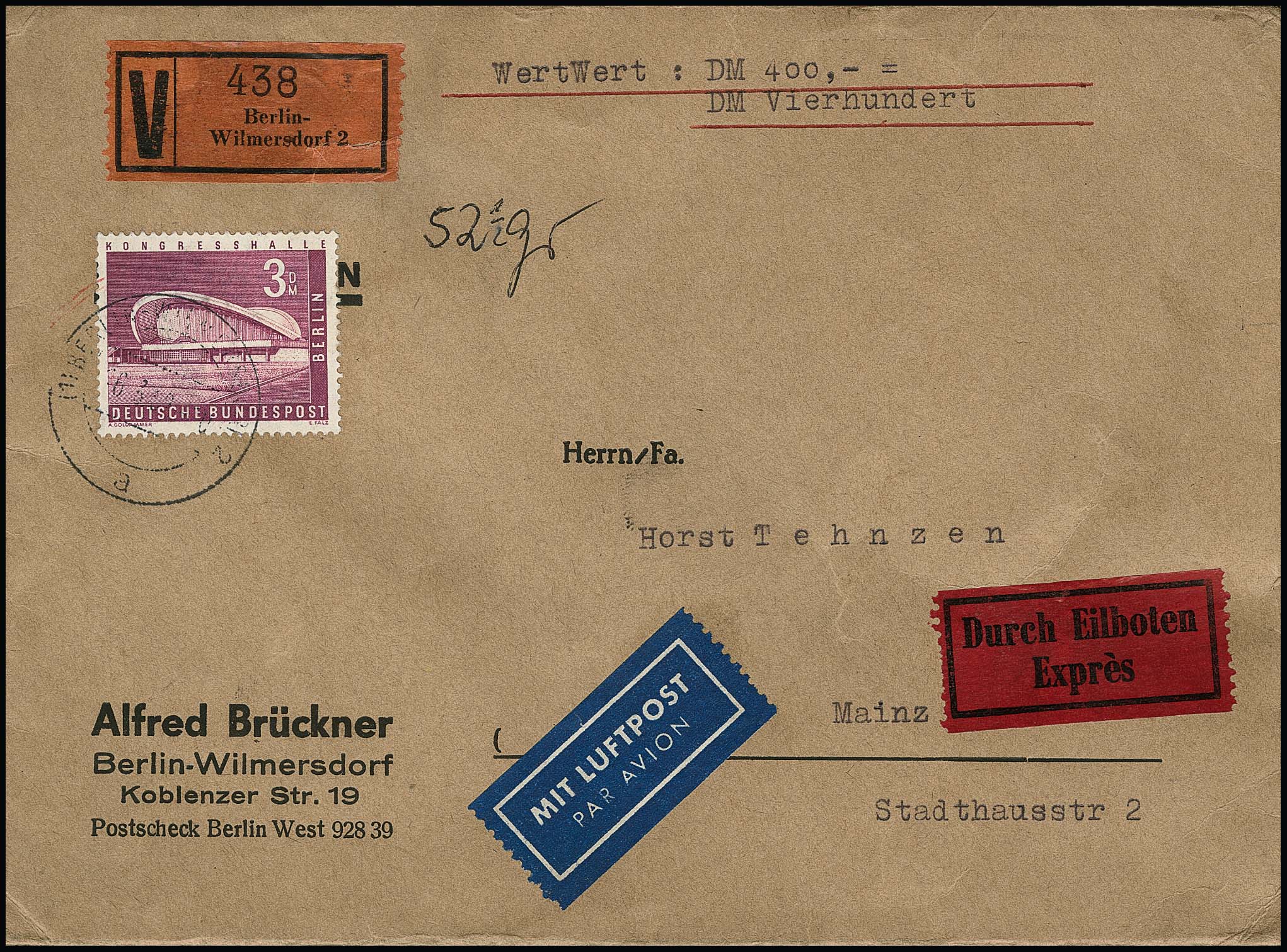 Fünf bessere Belege Bauten/Stadtbilder: Nr. 44 u. 123 (70 Pfg.) auf Lupo-R-Inlandsbrief ab Berlin, Nr. 149 im waager. Paar als MeF (Mi. "-.-"), Nr. 149(2) mit Nr. 141 u. 177 auf Lupo-R-Auslandsbrief, Nr. 153 (1 DM) als EF auf Lupo-Überseebrief von Berlin, sowie 3 DM Kongreßhalle einzeln auf Lupo-Expreß-Wertbrief ab Berlin (überfrankiert)
