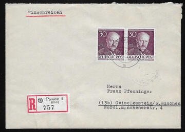 30 Pfg. Männer im Paar als portoger. MeF auf R-Brief (von H. Wittmann an Franz Pfenninger)