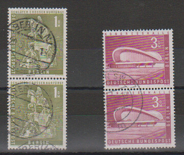 1 DM großer Kurfürst und 3 DM Kongreßhalle je in senkrechten Paaren mit "Berlin"-Rundstempeln. Mi. 550,-