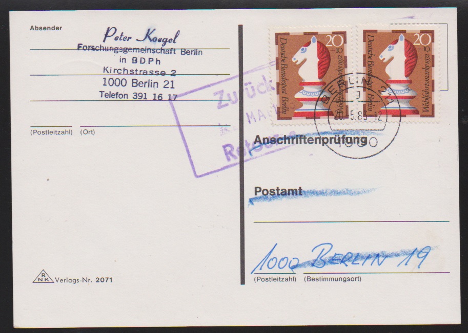 20 + 10 Pfg. Wohlfahrt als bessere Einzelfrankatur auf Ortsbrief, sowie per zwei als MeF auf Anschriftenprüfkarte, je aus Berlin