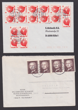 5 Pfg. Unfallverhütung per 16, sowie 20 Pfg. Knobelsdorff per vier, je als MeF auf zwei Briefen aus Berlin