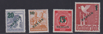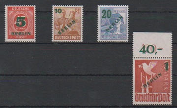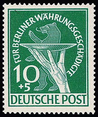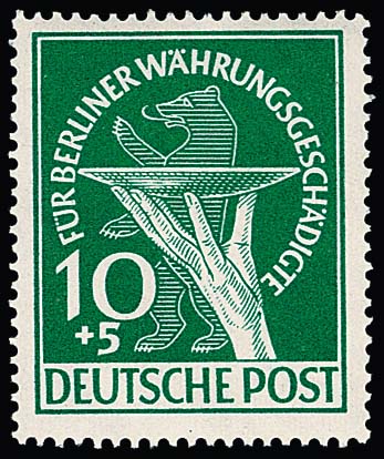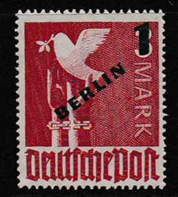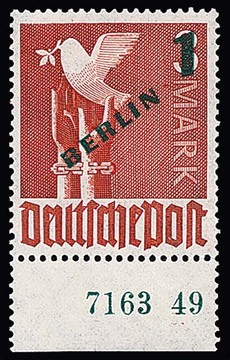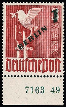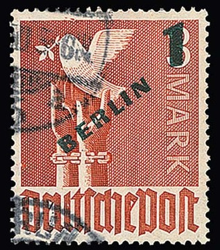 1 DM Grünaufdruck, "Berlin"-gestempeltes Bedarfsstück mit gut sichtbarem Plattenfehler der Urmarke, "Strich oben am Bildrand über Kopf der Taube", siehe Foto. Dieser Plattenfehler war gestempelt bisher nicht bekannt und ist im Michel ohne Preis!