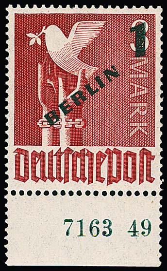 1 DM Grünaufdruck, postfrisches Unterrandstück mit fast kpl. HAN "7163.49", sign. Schlegel. Mi. für kpl. HAN 1000,-