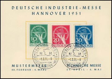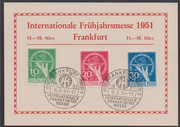 Währungsgeschädigte auf Luxuskarte mit SST der Frankfurter Frühjahrsmesse, dabei 30 Pfg. mit Plattenfehler I. Mi. lose 880,-