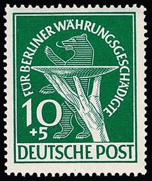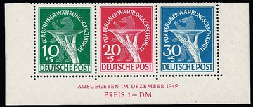 Währungsgeschädigte, postfrisches Herzstück aus Block mit beiden Plattenfehlern (10 Pfg. "gebrochenes C", 30 Pfg. "Strich an Opferschale"), Mi. der losen Einzelmarken 770,- ++