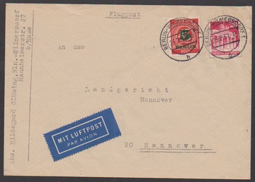 5 Pfg. Grünaufdruck als Lupo-Porto, nebst 20 Pfg. Bauten (mit Vorfaltung aufgeklebt), auf Lupo-Brief von Berlin-Wilmersdorf, 23.2.51, nach Hannover