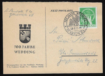 10 Pfg. Währungsgeschädigte als Einzelfrankatur auf portoger. Ortskarte aus Berlin, Mi. 470,-